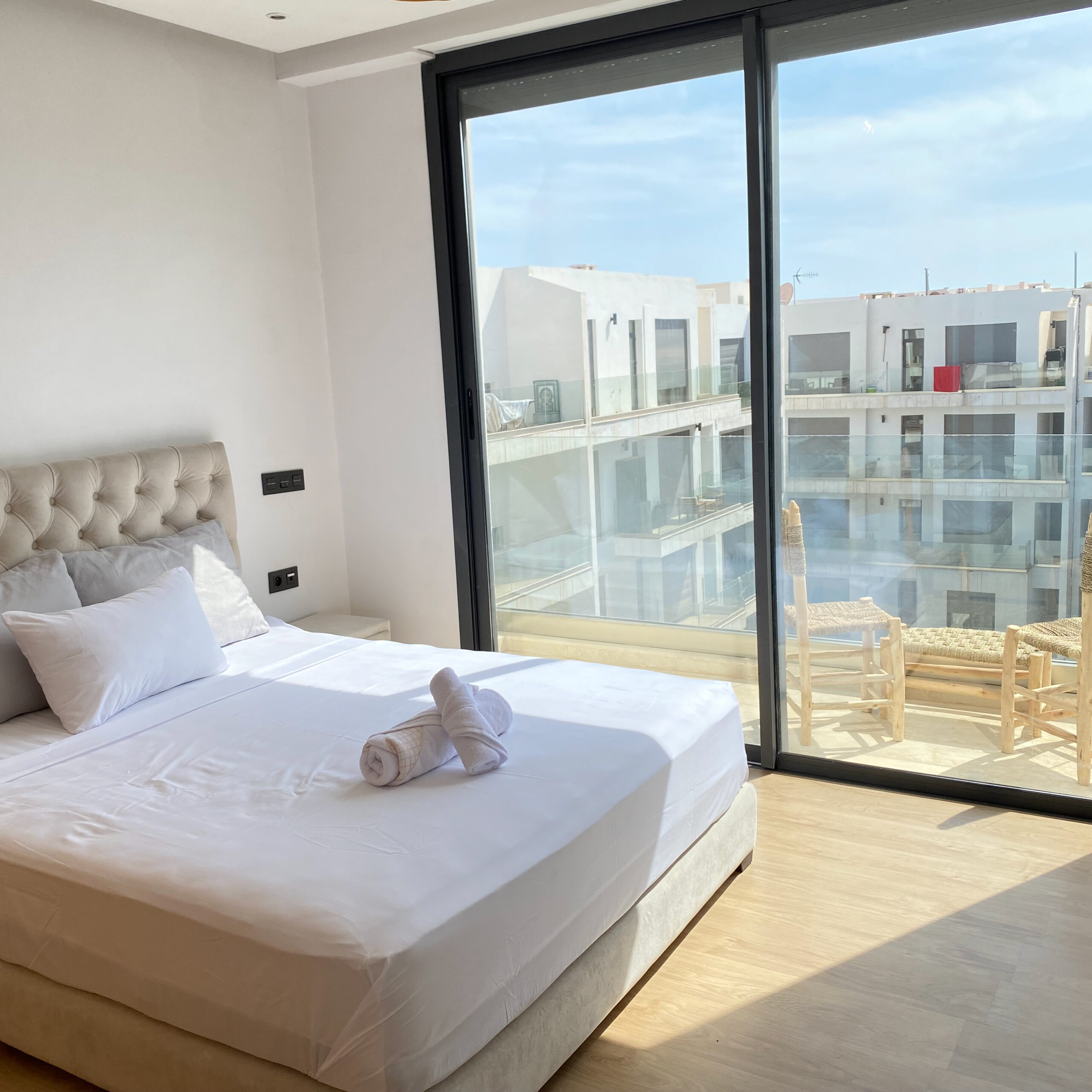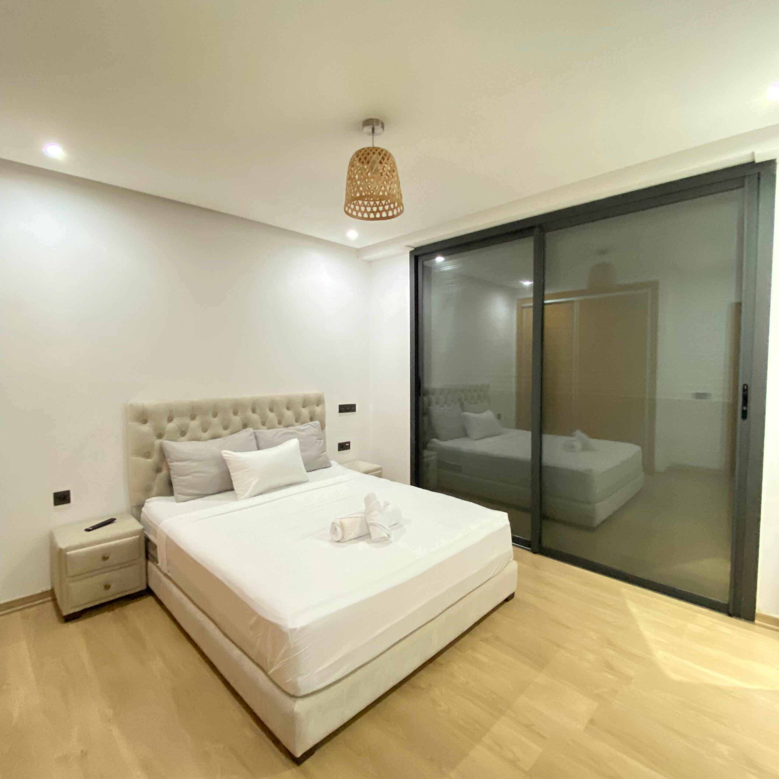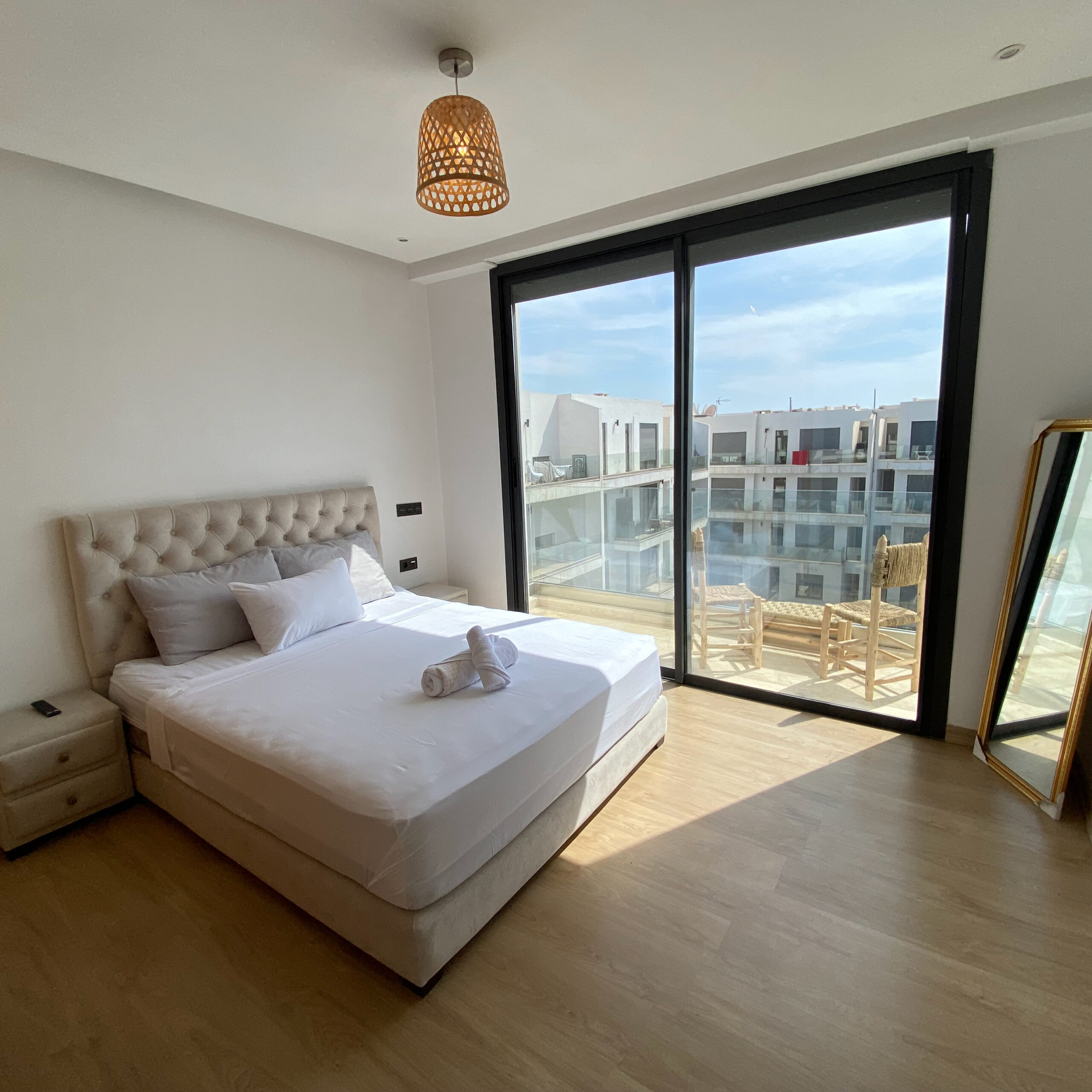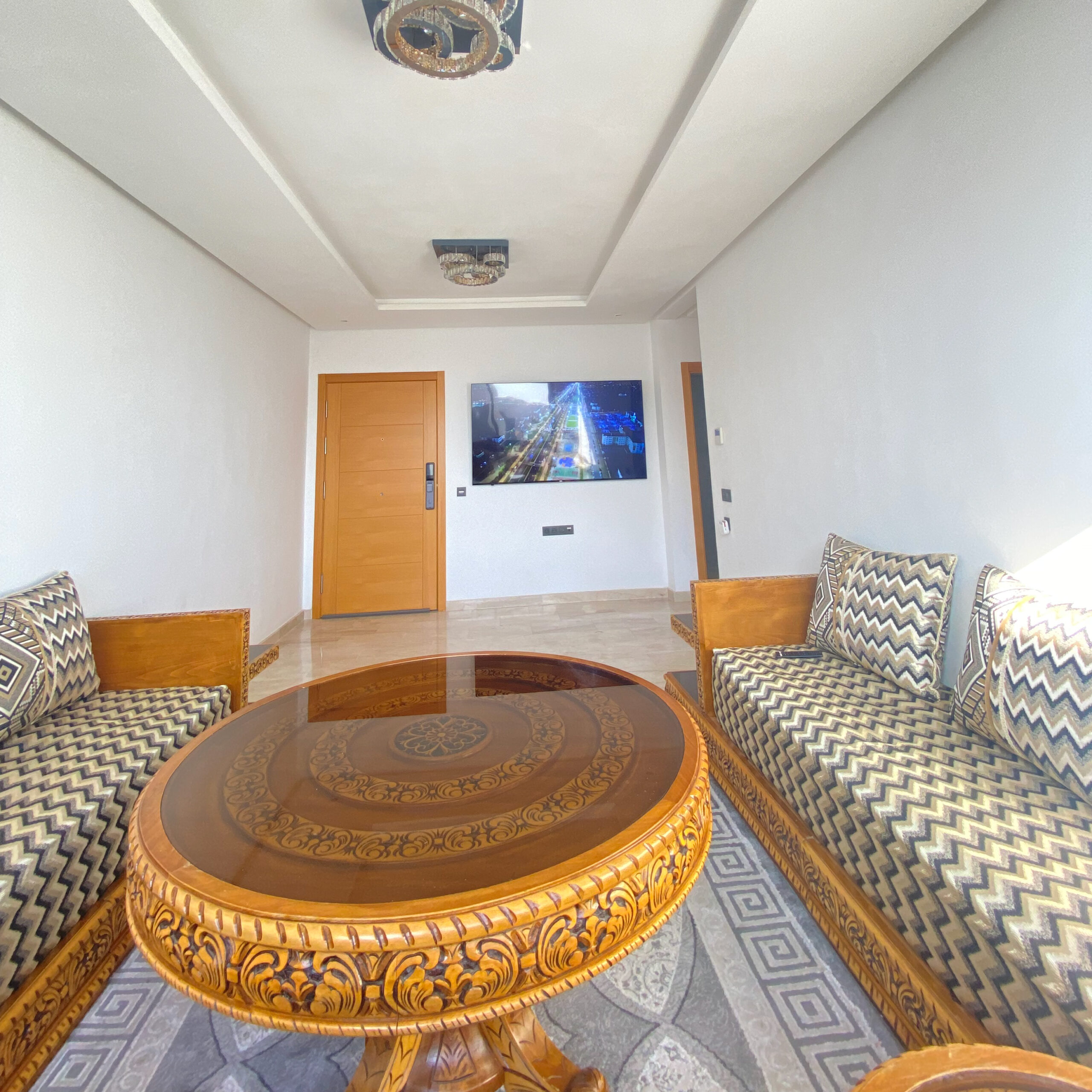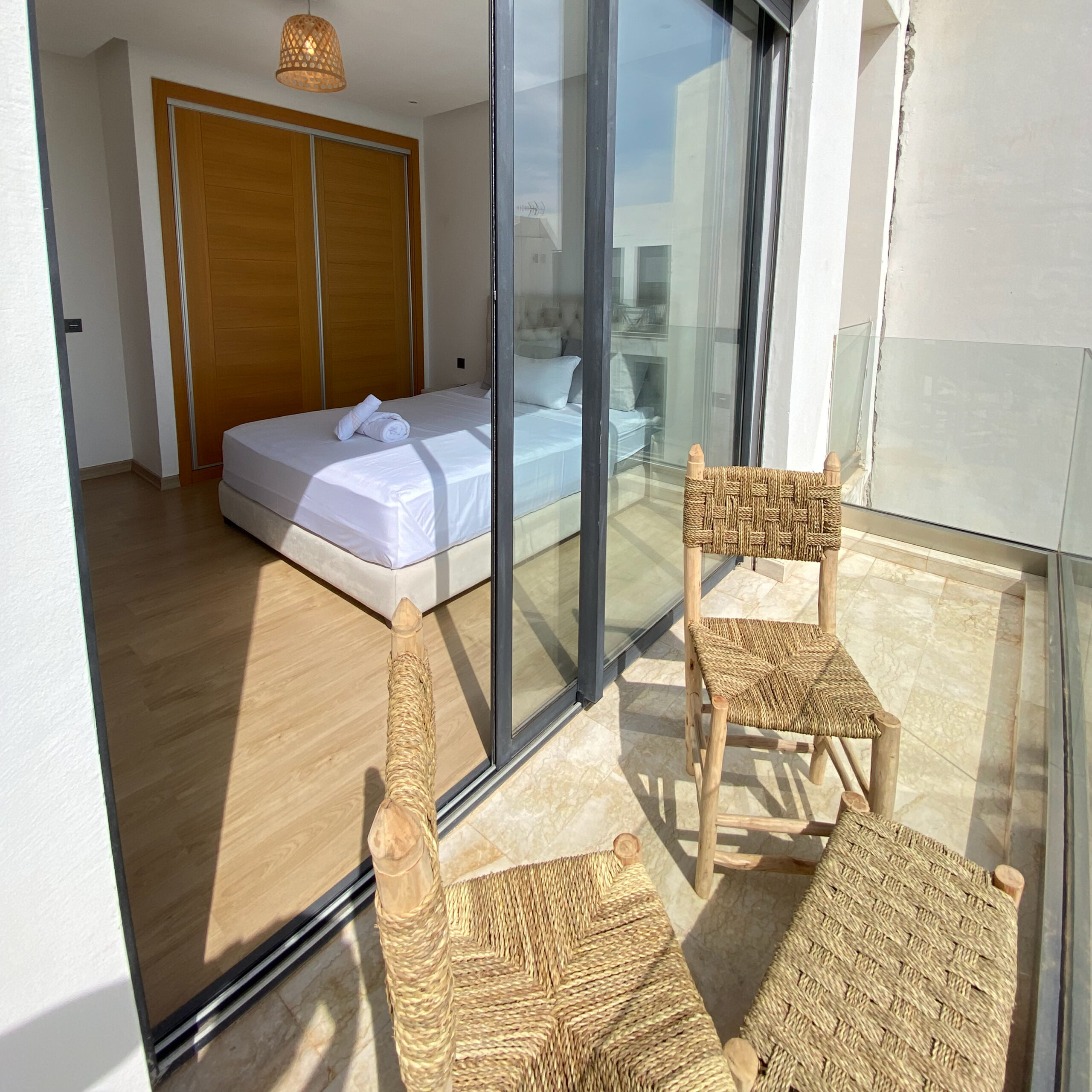 Modern 2-bedroom apartment in Agadir Bay with a bright Moroccan-style living room, a bathroom with shower, and a separate toilet. The master bedroom features a private balcony with a stylish seating area. Fully equipped, clean, and bathed in natural light. Secure residence with underground parking and a swimming pool.