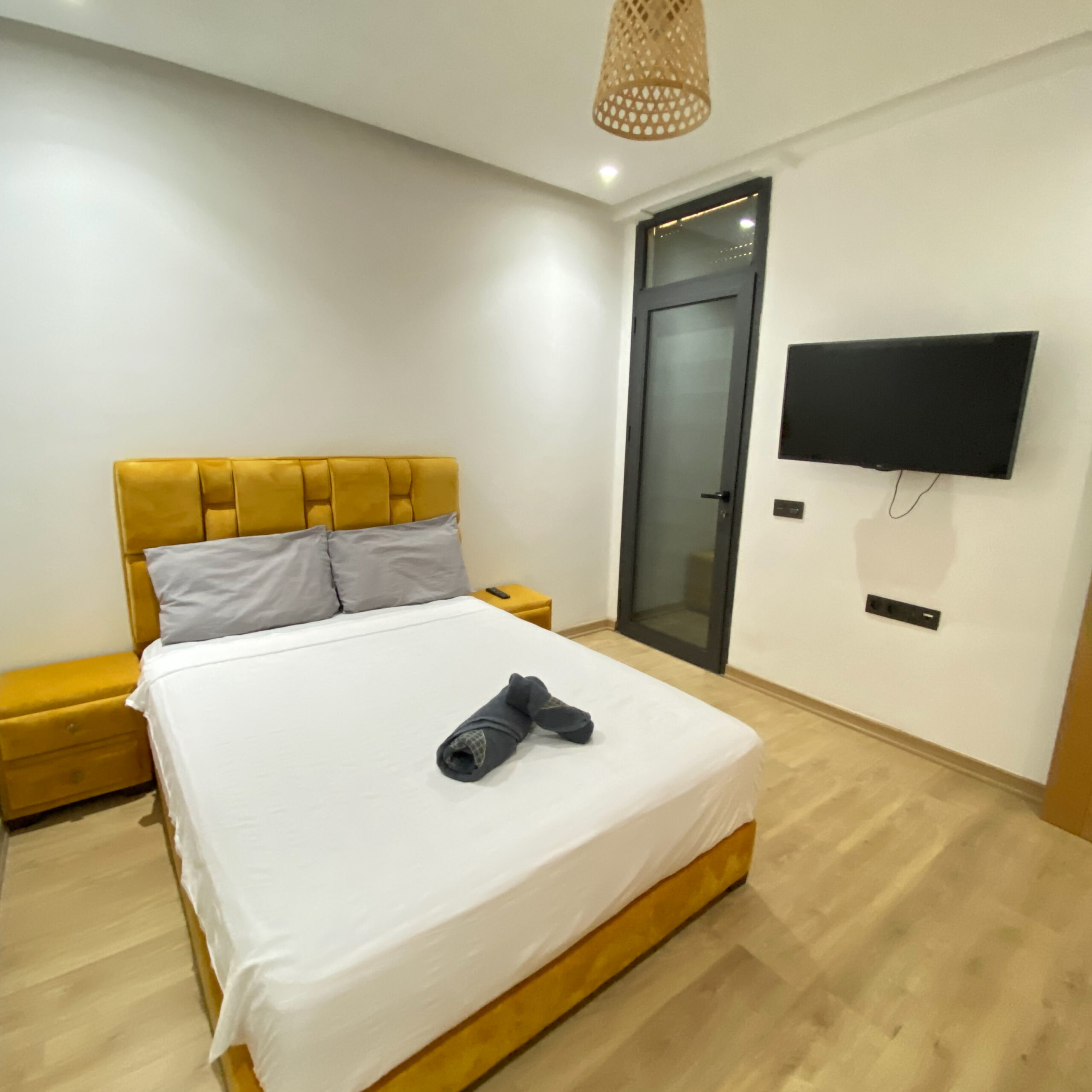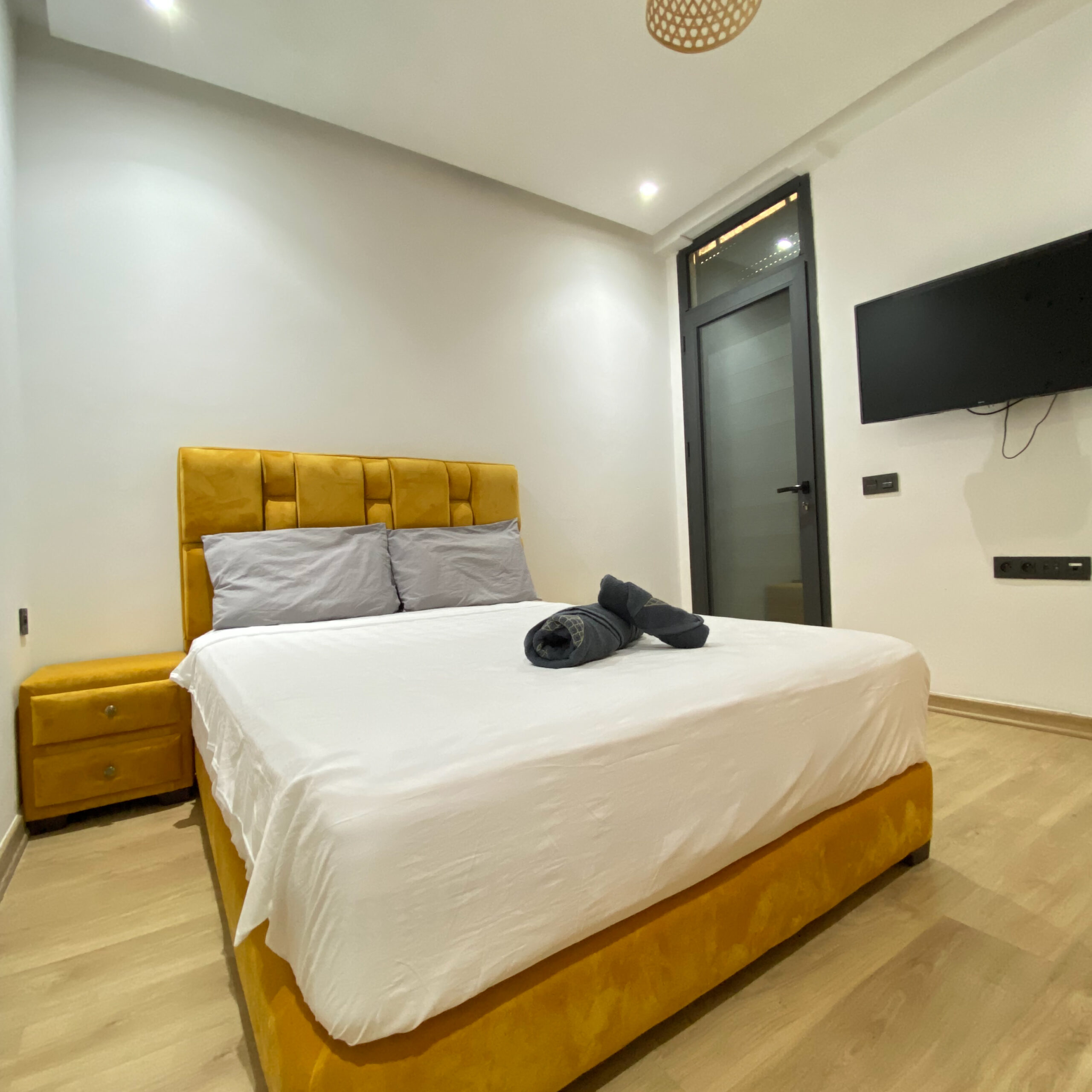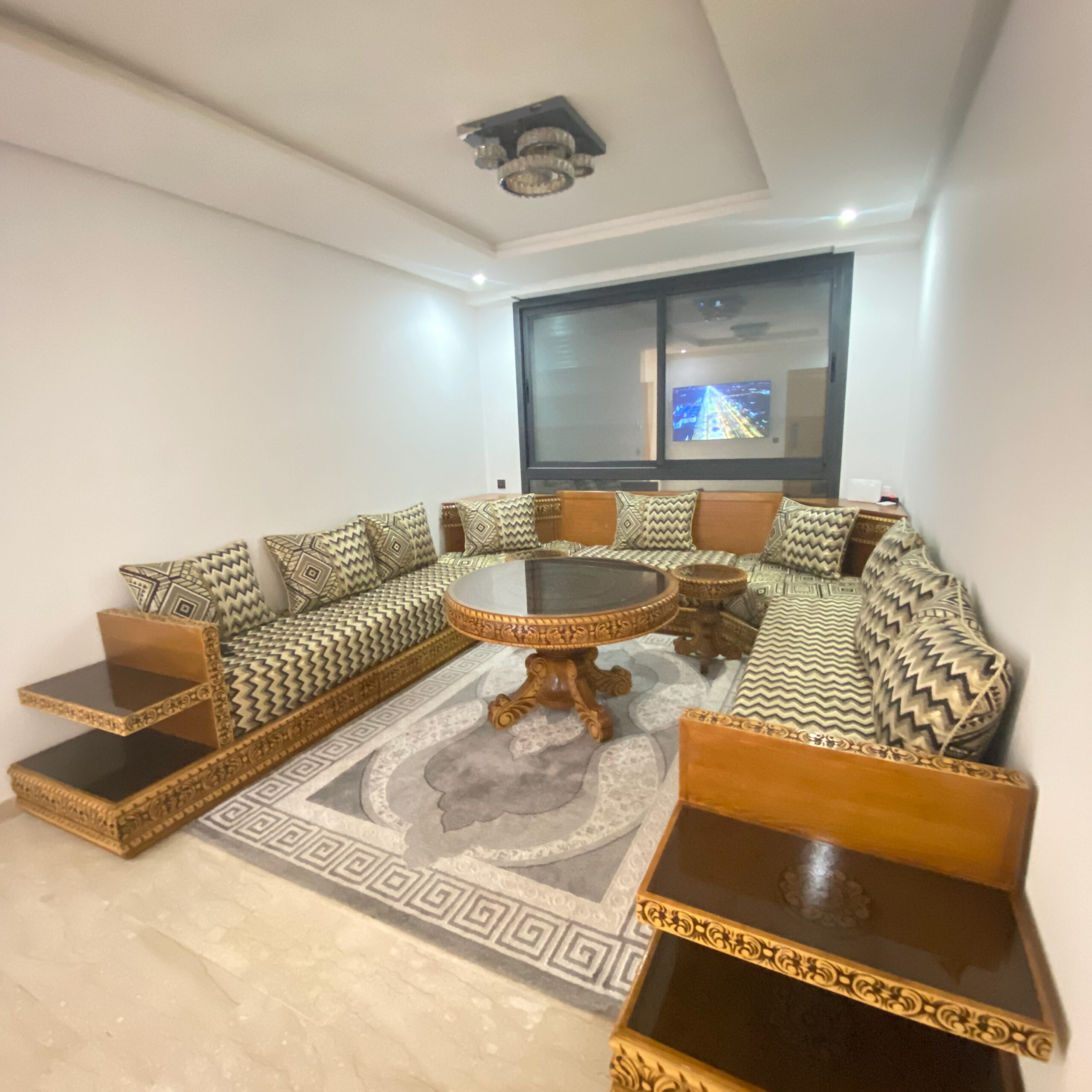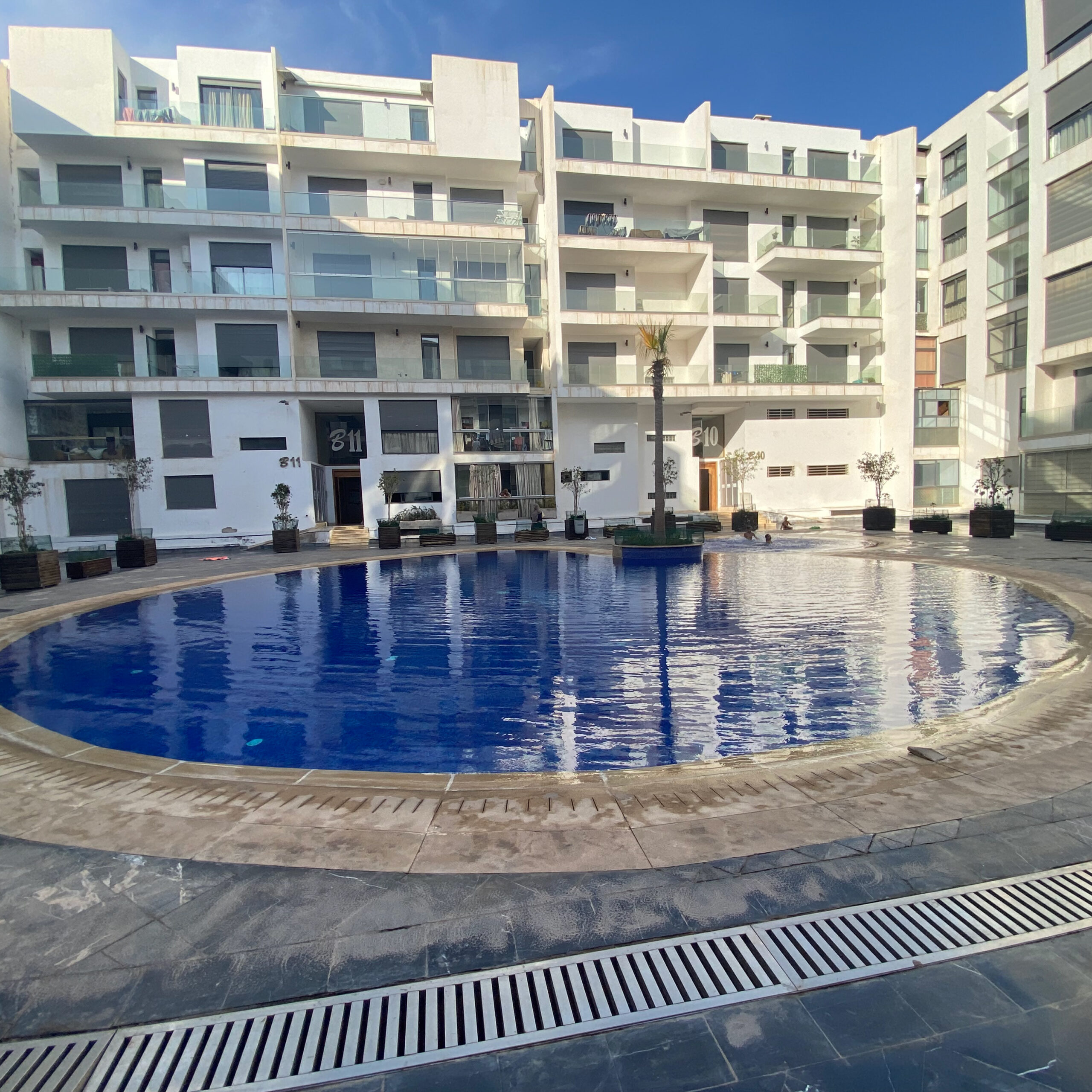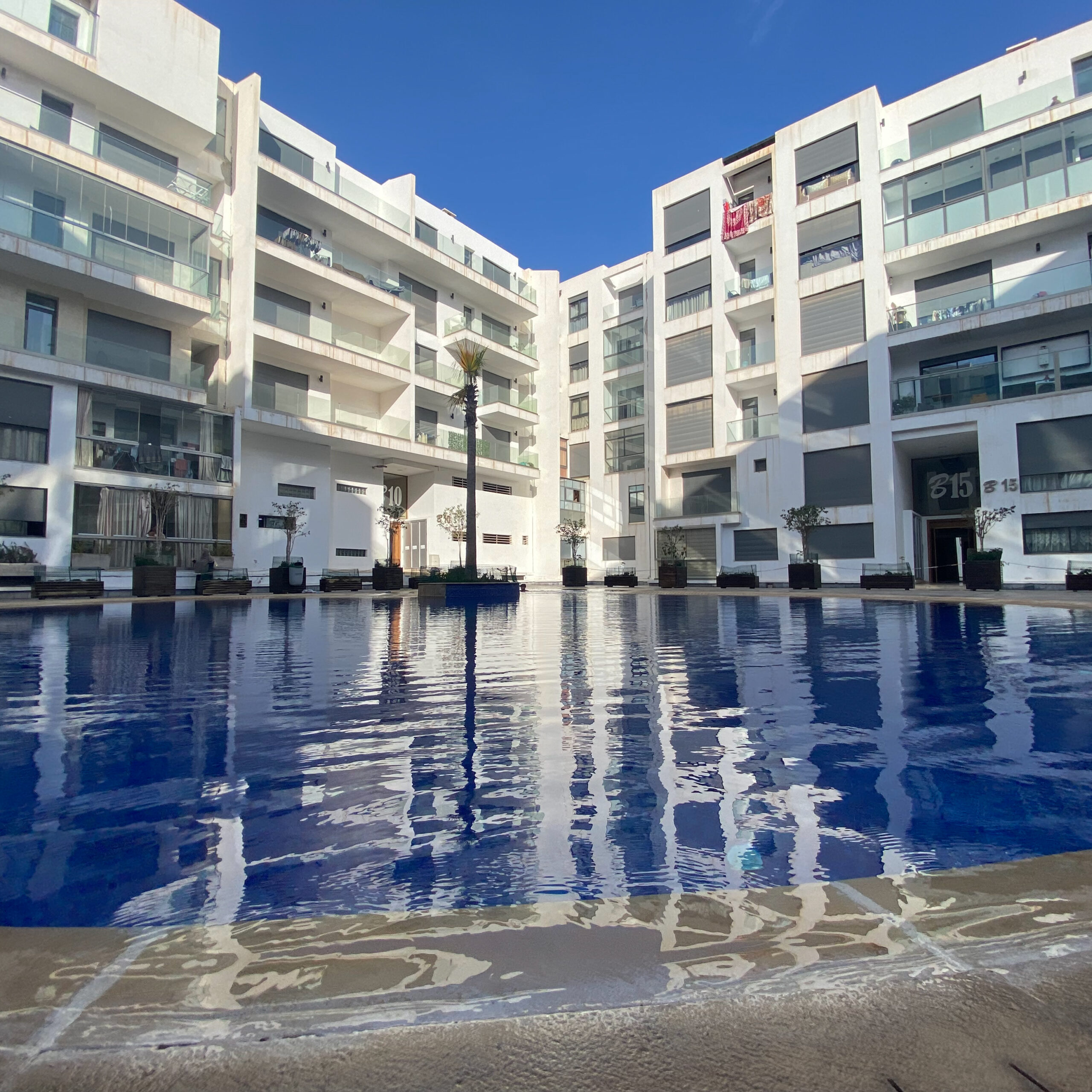 Modern 2-bedroom apartment in Agadir Bay with a bright Moroccan-style living room, a bathroom with shower, and a separate toilet. The master bedroom features a private balcony with a stylish seating area. Fully equipped, clean, and bathed in natural light. Secure residence with underground parking and a swimming pool.