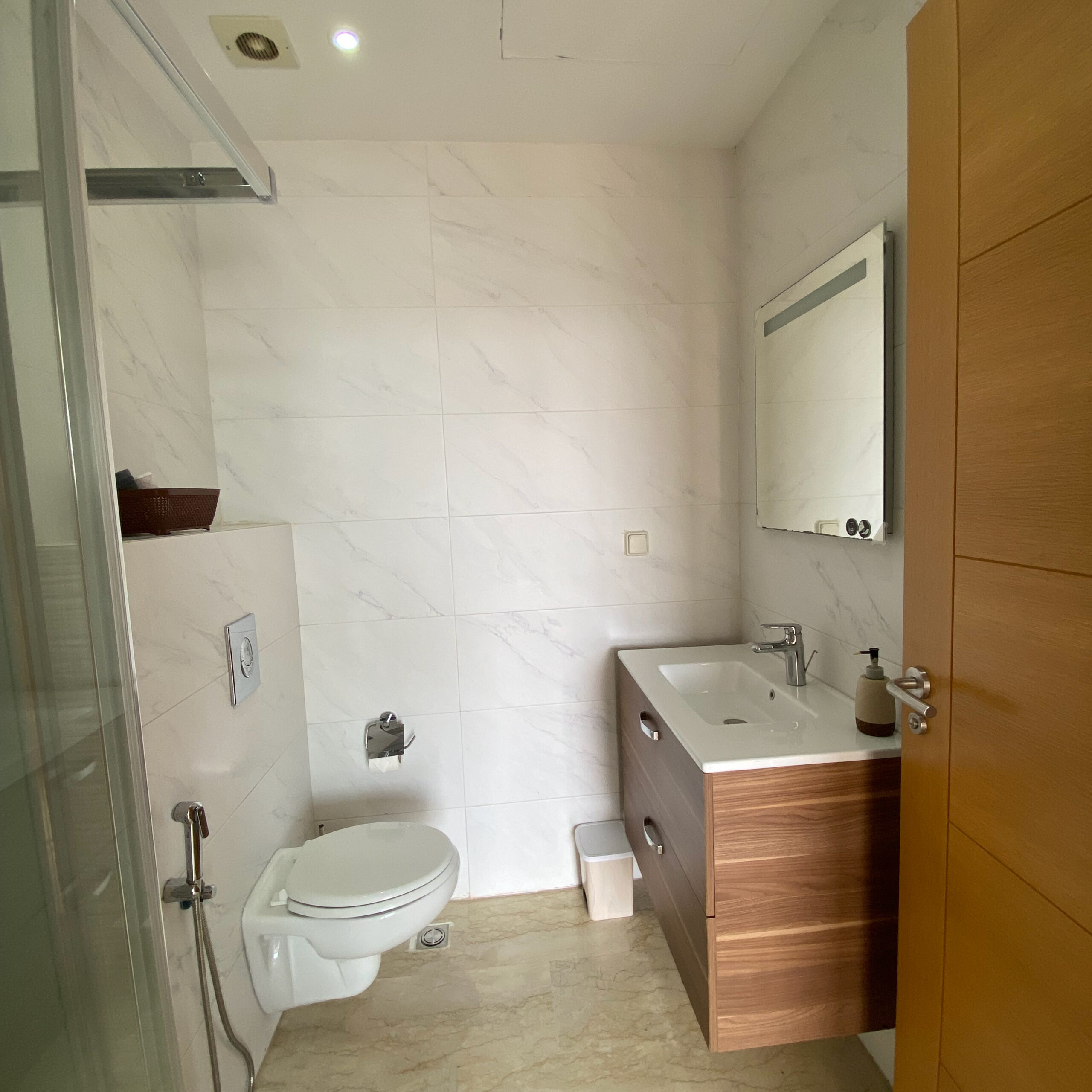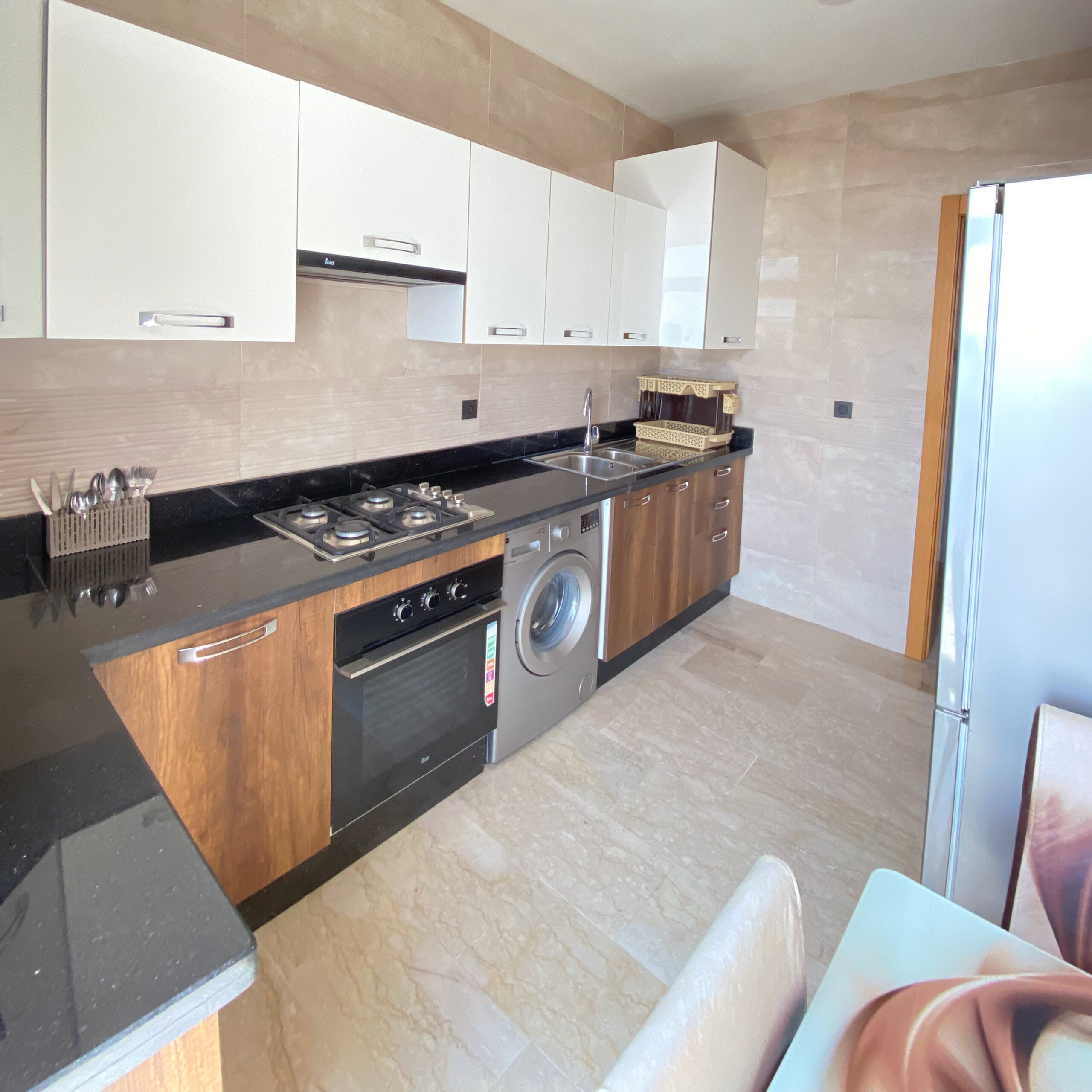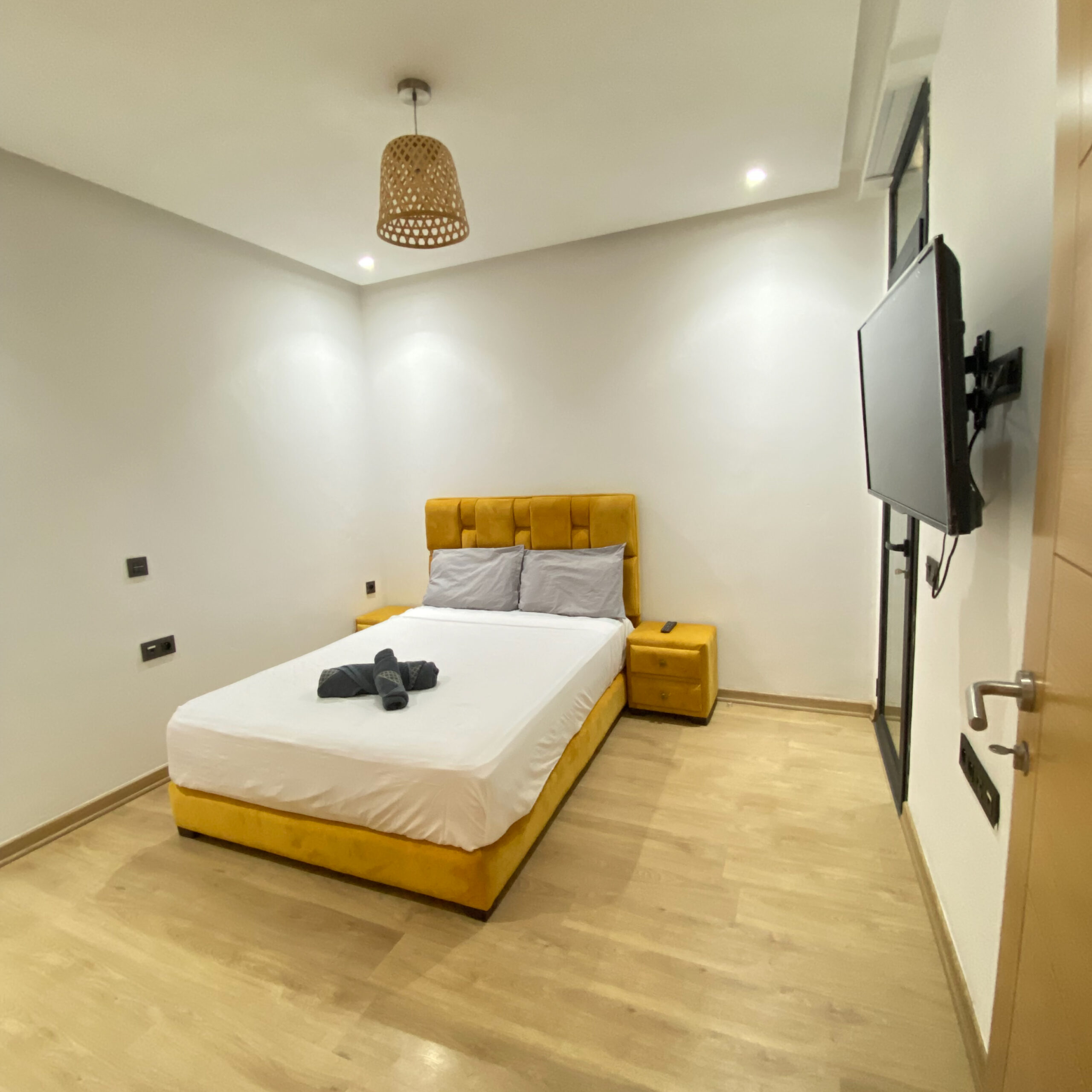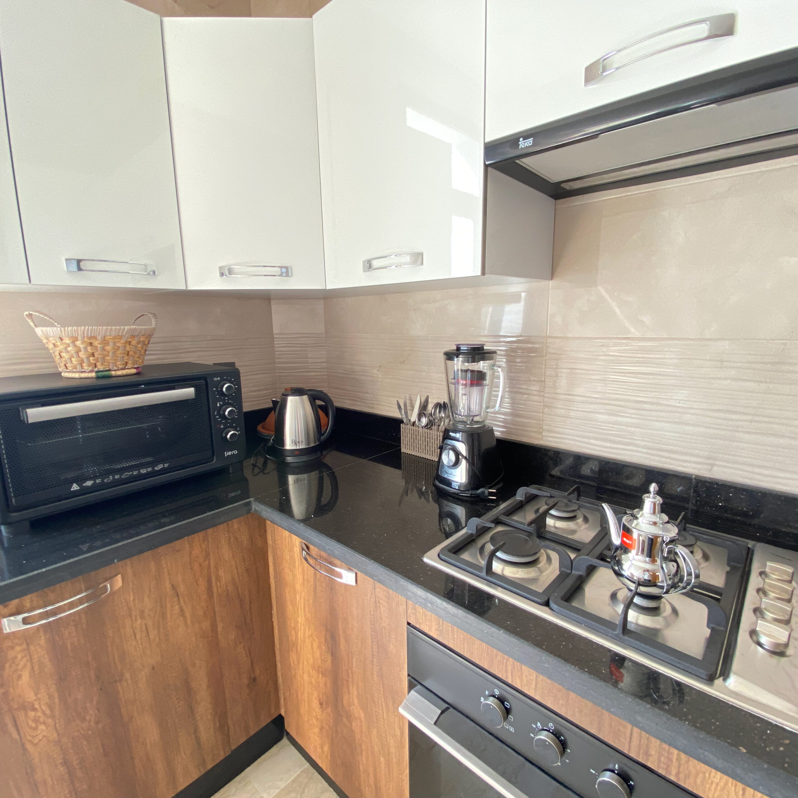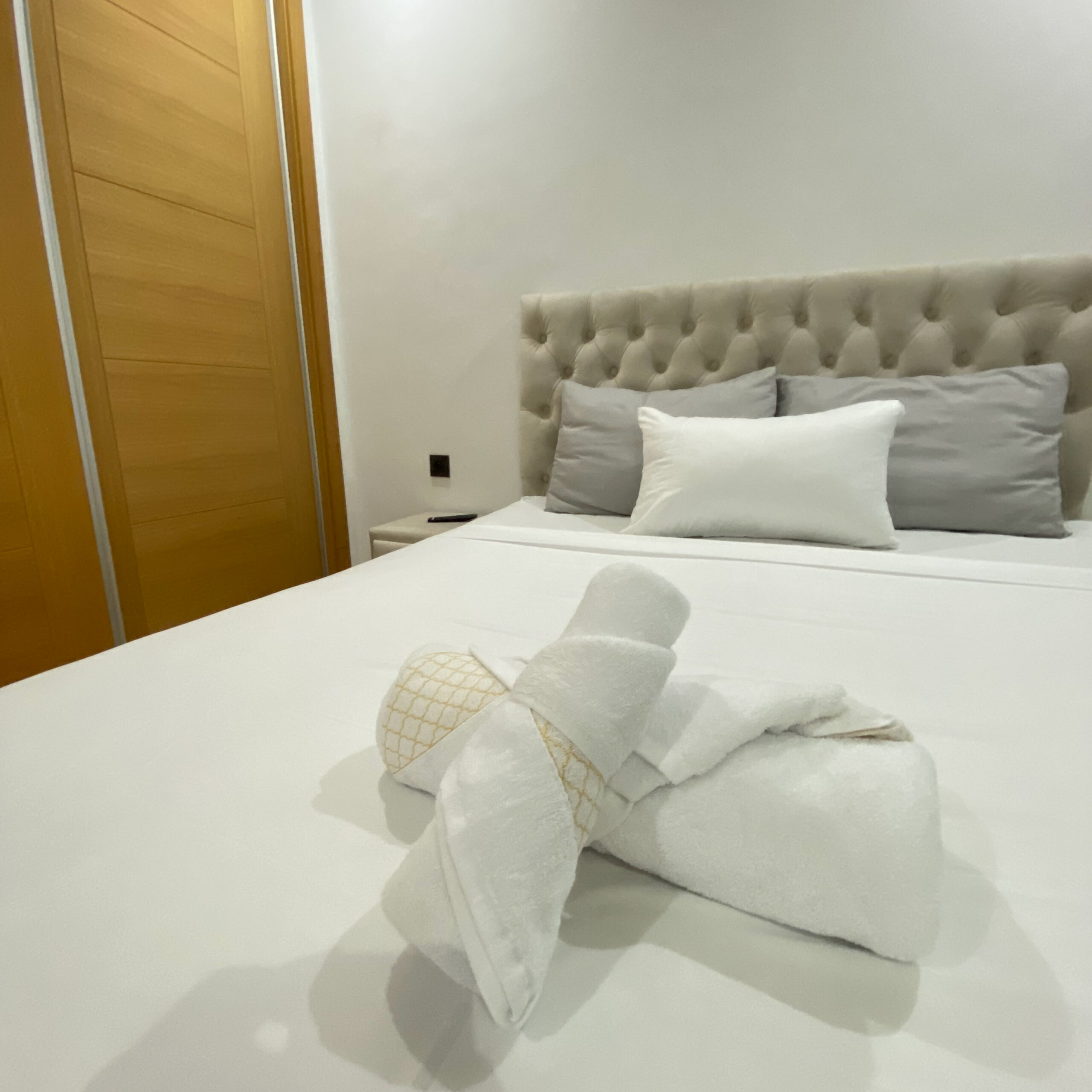 Modern 2-bedroom apartment in Agadir Bay with a bright Moroccan-style living room, a bathroom with shower, and a separate toilet. The master bedroom features a private balcony with a stylish seating area. Fully equipped, clean, and bathed in natural light. Secure residence with underground parking and a swimming pool.