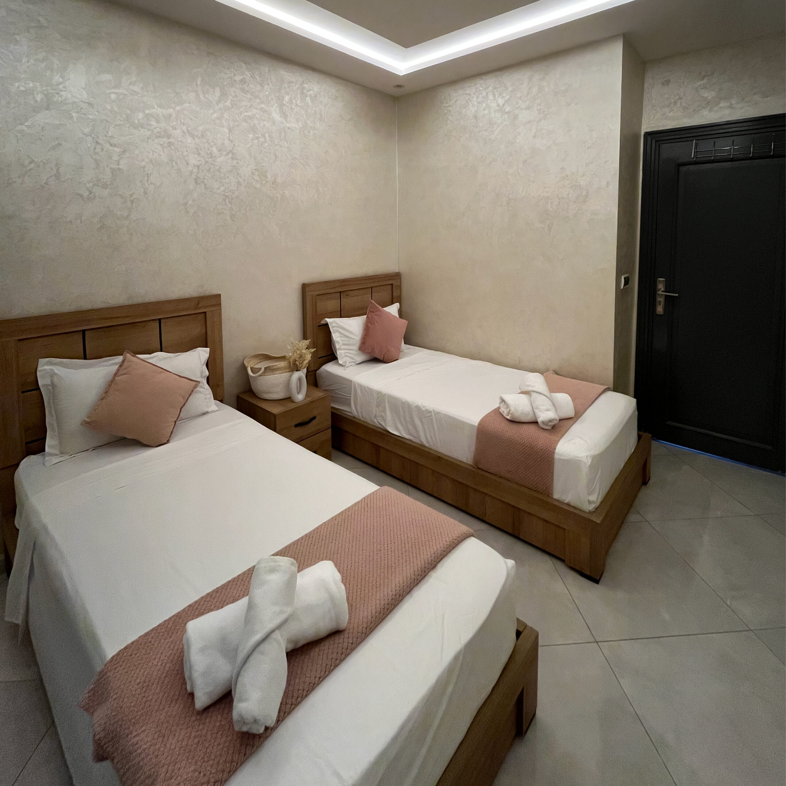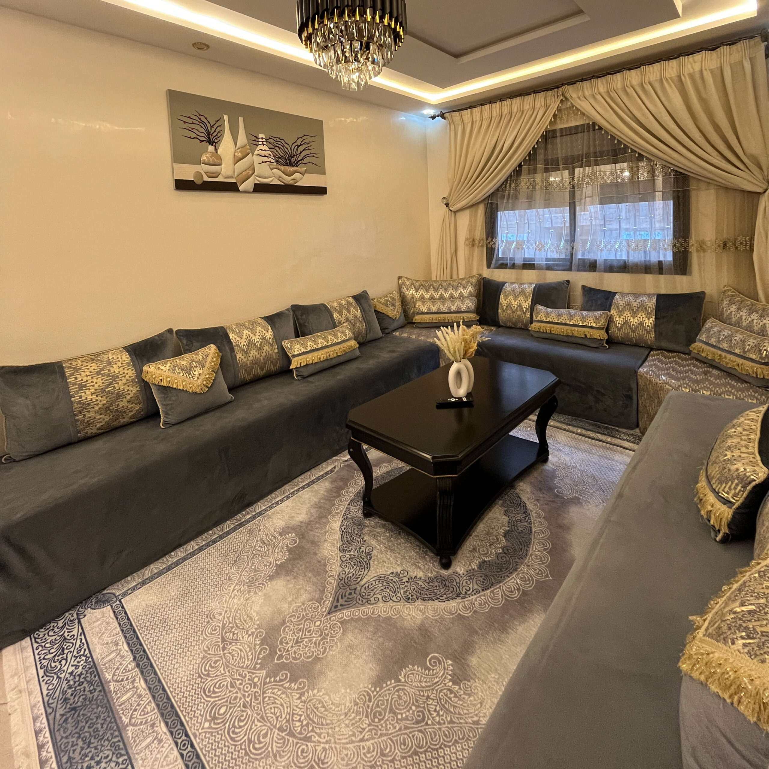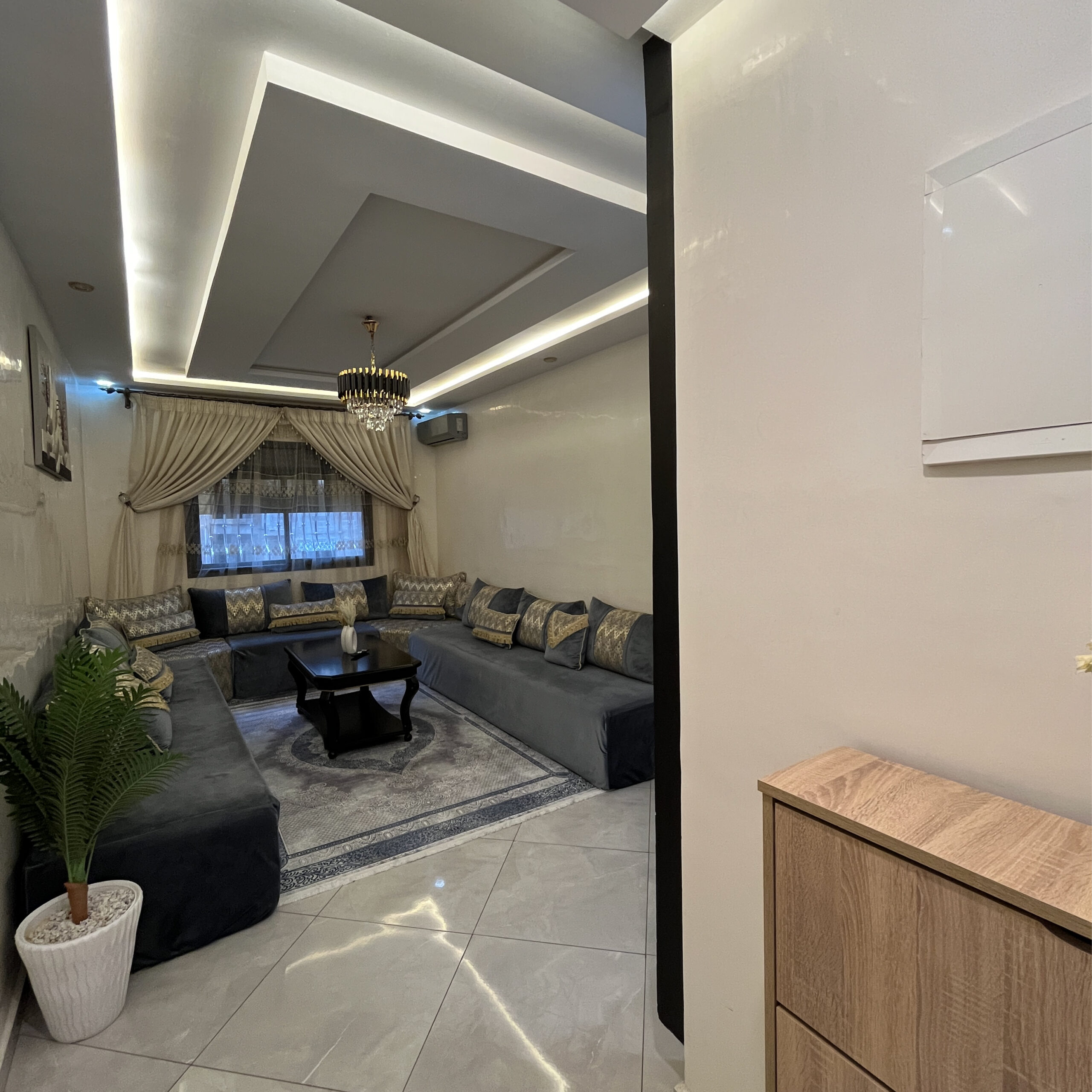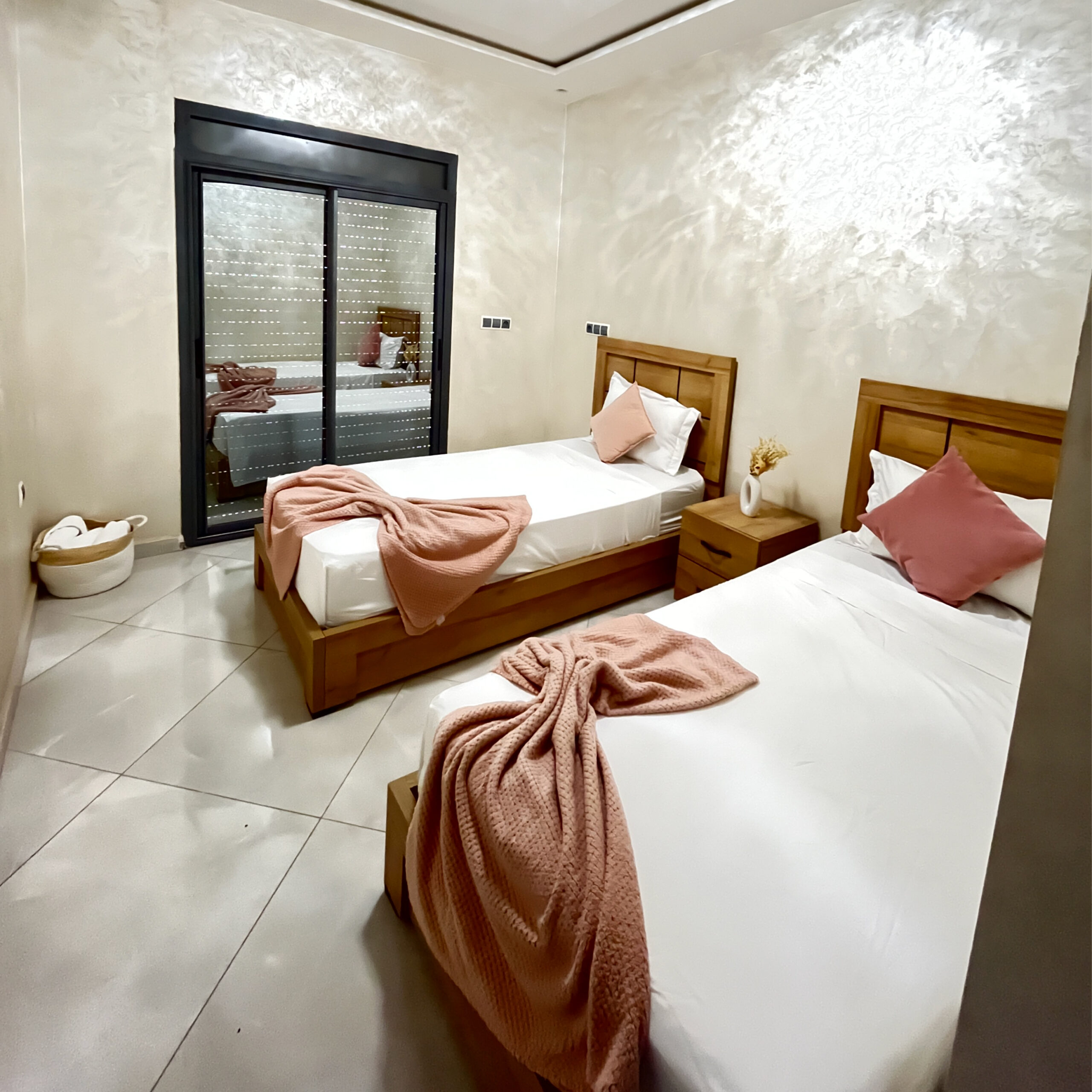 Cozy, bright, and modern apartment in Cité Adrar. Living room with sofa bed, master suite with furnished balcony, bedroom with single beds, and a hotel-style bathroom. 24/7 secure building. 2 minutes from Sela Park, close to shops, taxis, beaches, and attractions. Ideal for families, couples, and business travelers.
